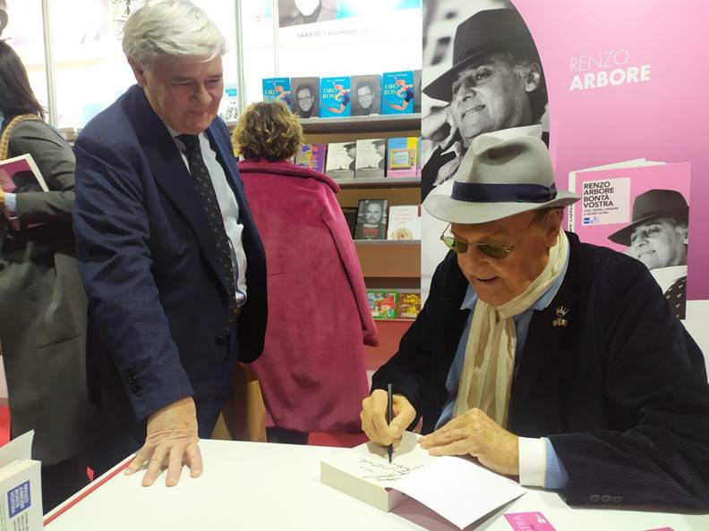“Più libri, più liberi”. Pubblico delle grandi occasioni alla Nuvola di Fuxas, alla Fiera Nazionale della Piccola e Media Editoria, dove per un attimo ci è sembrato di essere capitati nel cuore di uno studio televisivo con sul palcoscenico un Renzo Arbore più geniale e più divertente che mai.