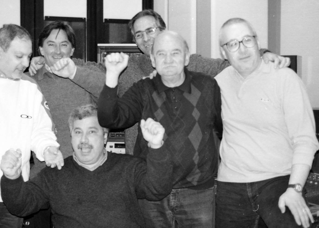 da sinistra: Giancarlo Geri, Tonino Raffa, Pino Nano, Tonino Serafini, Oloferne Carpino e Lello Malito nella nuova sede RAI di Viale Marconi a Cosenza
